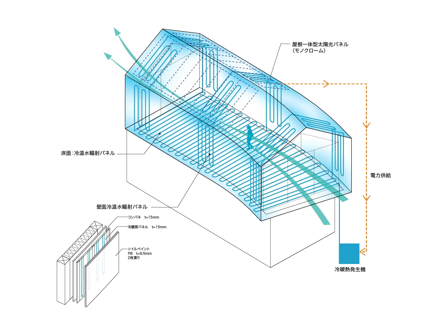 2階部分は、敷地に沿って曲がった形の設計になっています。断面で見ると、建物が海の方に向かっていくようなイメージですね。まるで風を迎えに行くようなトンネル状の空間にすることで、より自然な風の流れを取り込めるのでは、と考えました。 より詳しく解析してみると、建物が曲がっていることで風の流れが良くなり、体感温度も下がることが分かりました。2階を風が通り抜ける際には、地下からの冷たい空気を吸い上げるような効果も生まれます。 屋根についても、建物に合わせた曲線的な仕上げを、いかに一体的に見せるかが重要なポイントになりました。モノクロームさんと何度も協議を重ねる中で、最終的に屋根の一部に屋根一体型の発電設備を組み込むことにしました。その結果、パネルが目立つことなく、自然な景観を実現することができたんです。