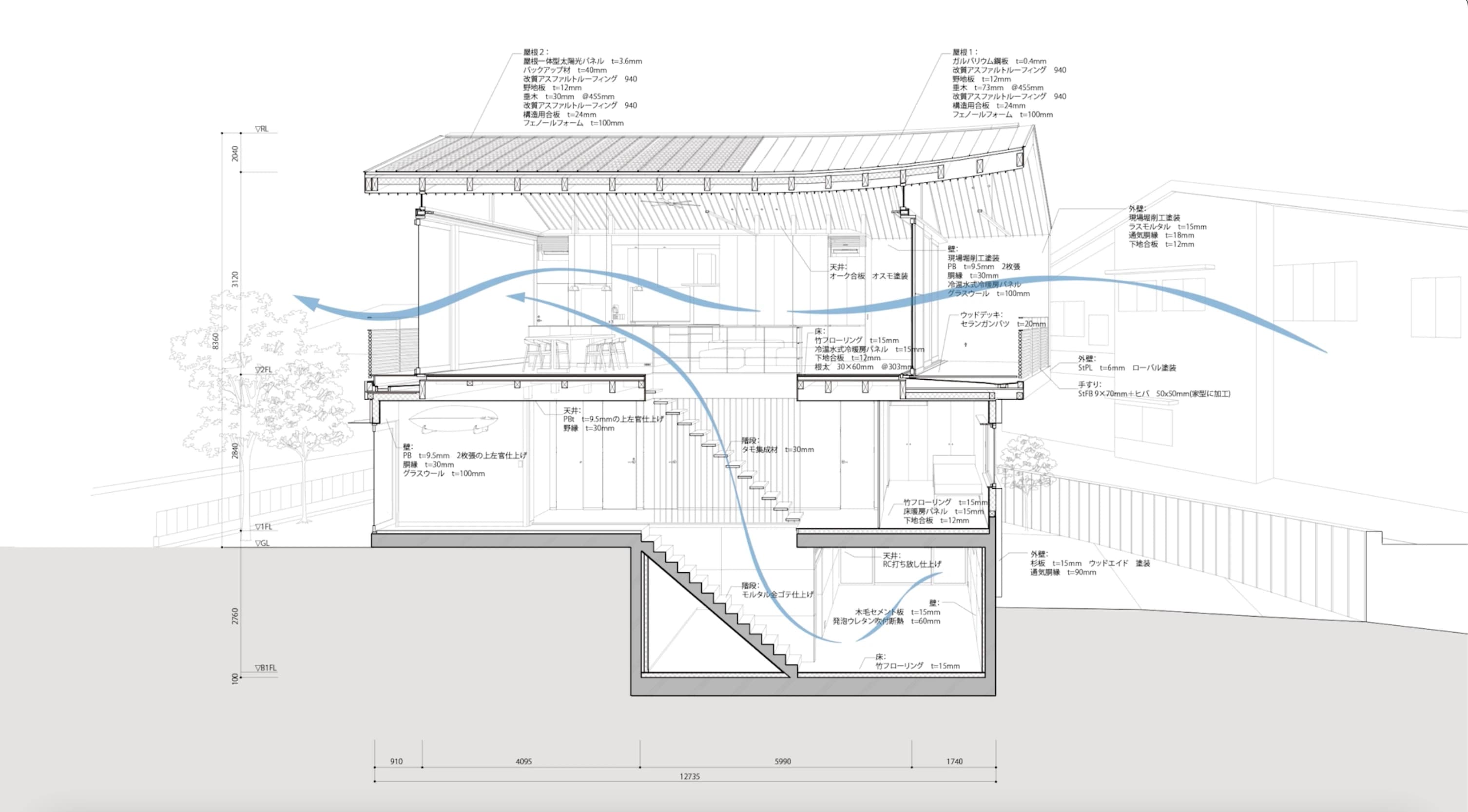 私は瀬戸内海に面した愛媛県松山市の出身で、海が比較的近い環境で育ちました。幼い頃から、たまたま親が船を持っていたこともあり、毎週末のように釣りや島巡りを楽しんでいました。パートナーの末光陽子は福岡県八女市の出身で、熊本寄りの山間部で育っています。山に囲まれた環境で過ごし、自然の中での生活が身近だったようです。 私たちは大学進学を機に東京に出てきましたが、都市の中でももっと自然を感じながら暮らせないか、という意識は共通して持っていました。そうした思いが、建築を考える上での原点になっているかもしれません。 海は陸に比べて気温が約4度低いとされ、海風が届くのは内陸10キロほどの範囲と言われています。そのエリアでは海の影響で涼しい空気が流れ込みますが、それ以上内陸に入ると風が届きにくくなります。例えば、埼玉のような地域では夏に気温が40度を超えることもありますが、その一因として風が入りにくい地理条件が挙げられます。 海の涼しいエネルギーをいかに建築に取り込むか、と考えたら、やはりエネルギーを運んでくる海風が鍵になります。風という自然の恵みを建築にどう活かしていくかについては、「風の家」以前から意識してきました。
