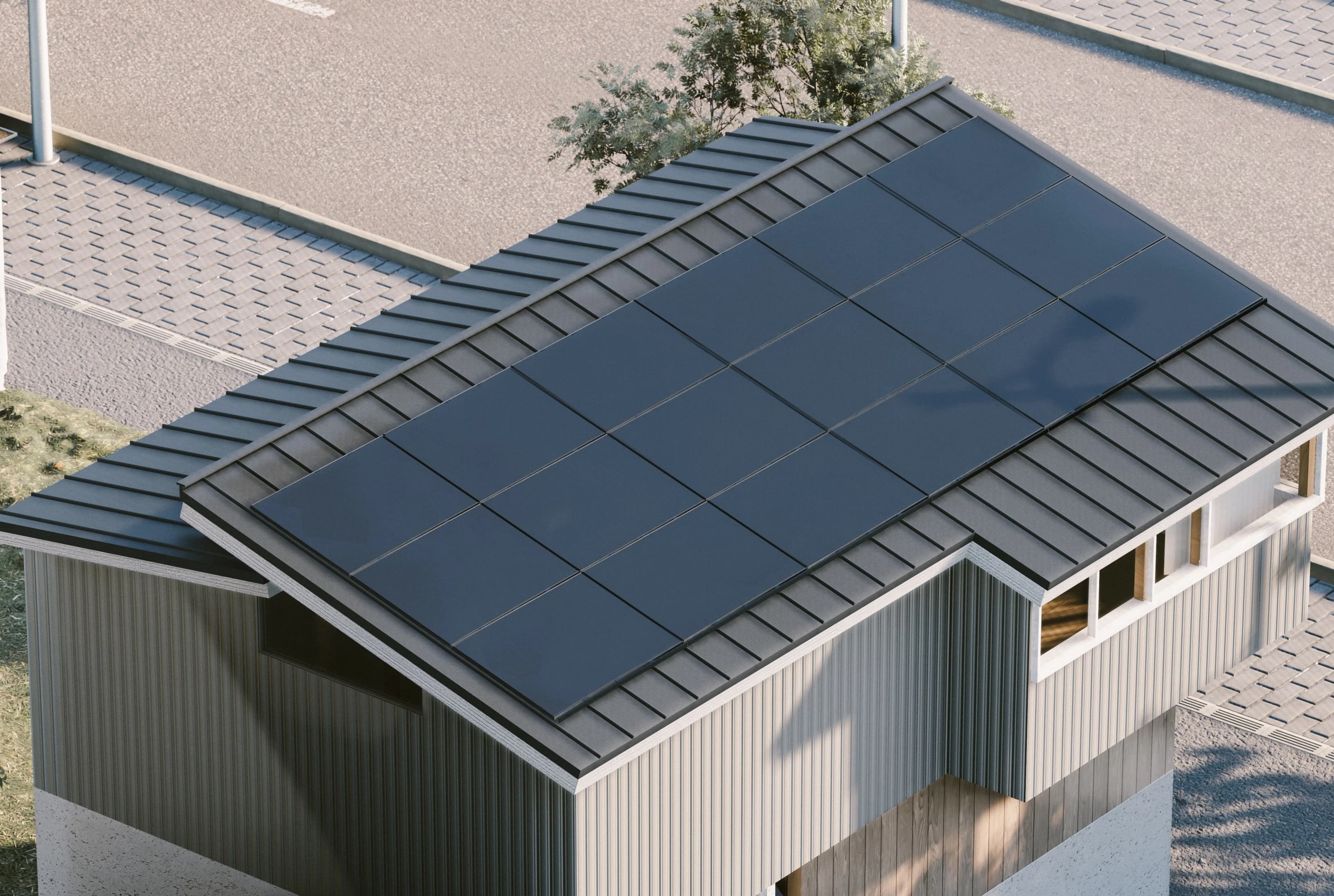 Roof-1は金属屋根に特殊加工した太陽光セルを組み込むことで、普通の屋根にしか見えないデザインを実現した屋根一体型太陽光パネルです。一般的な住居用太陽光パネルは屋根、架台、太陽光パネルを設置するのに比較し、屋根だけの設置となるため1回の施工で完了する他、高いメンテナンス性も実現しています。