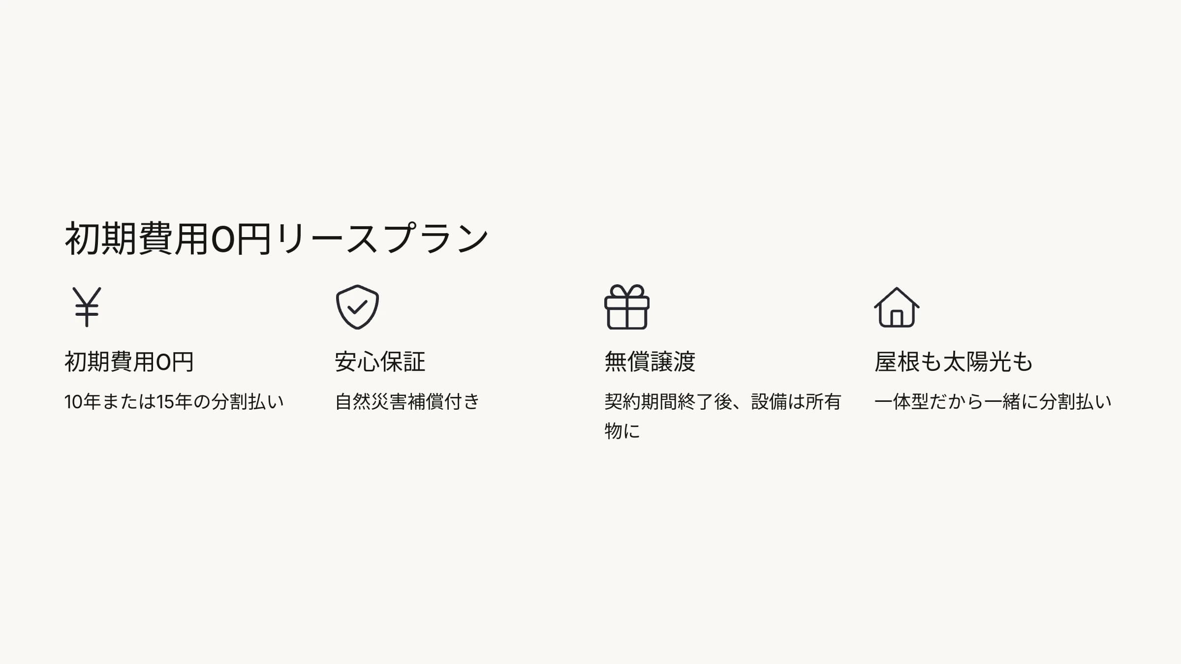 「初期費用が気になる…」という方には、初期費用0円かつ割賦払いが可能なリースプランの選択肢もあります。契約期間が終了すれば設備は無償譲渡され、契約者様の所有物になる安心のプランです。