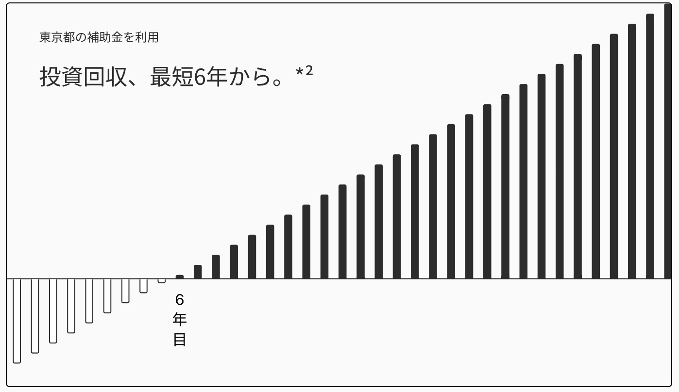 **導入コストはRoof-1 4.95kWを導入した場合。 ・太陽光発電部分のみ(関連電気工事、パワコン、申請費用を含め)、屋根部分の費用は含まれない。 ・蓄電池は補助金対象であるHuawei Luna 10kWhモデルを想定。 ・補助金は東京都「災害にも強く健康にも資する断熱・太陽光住宅普及拡大事業」を活用することを想定。
