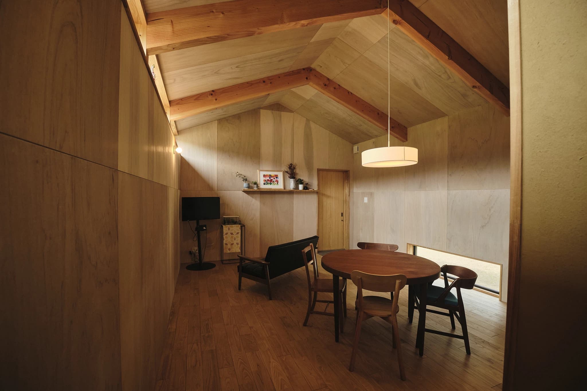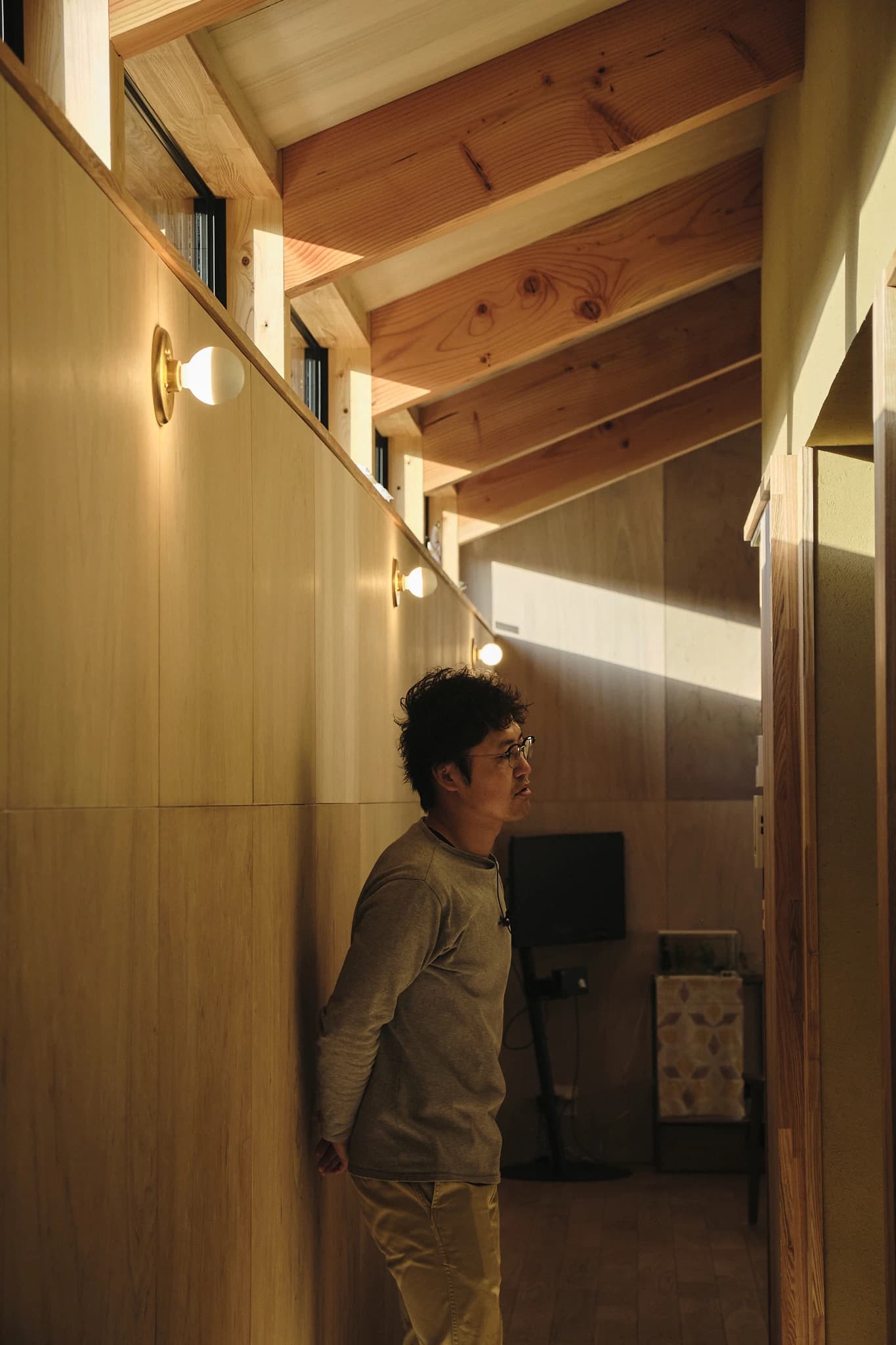 家全体を支えるのは、三角形をした木のフレームを繰り返し並べた屋根の骨組みだ。この山型のフレームが建物の端から端まで連続していて、屋根の下にひとつながりの空間を生み出している。天井はそのフレームの形をそのまま見せる仕上げになっていて、空間にリズムと高さを感じさせてくれる。少し話し込んでいる間にも、高窓から差し込む朝の光が角度をわずかに変え、室内にやさしく広がっていく。