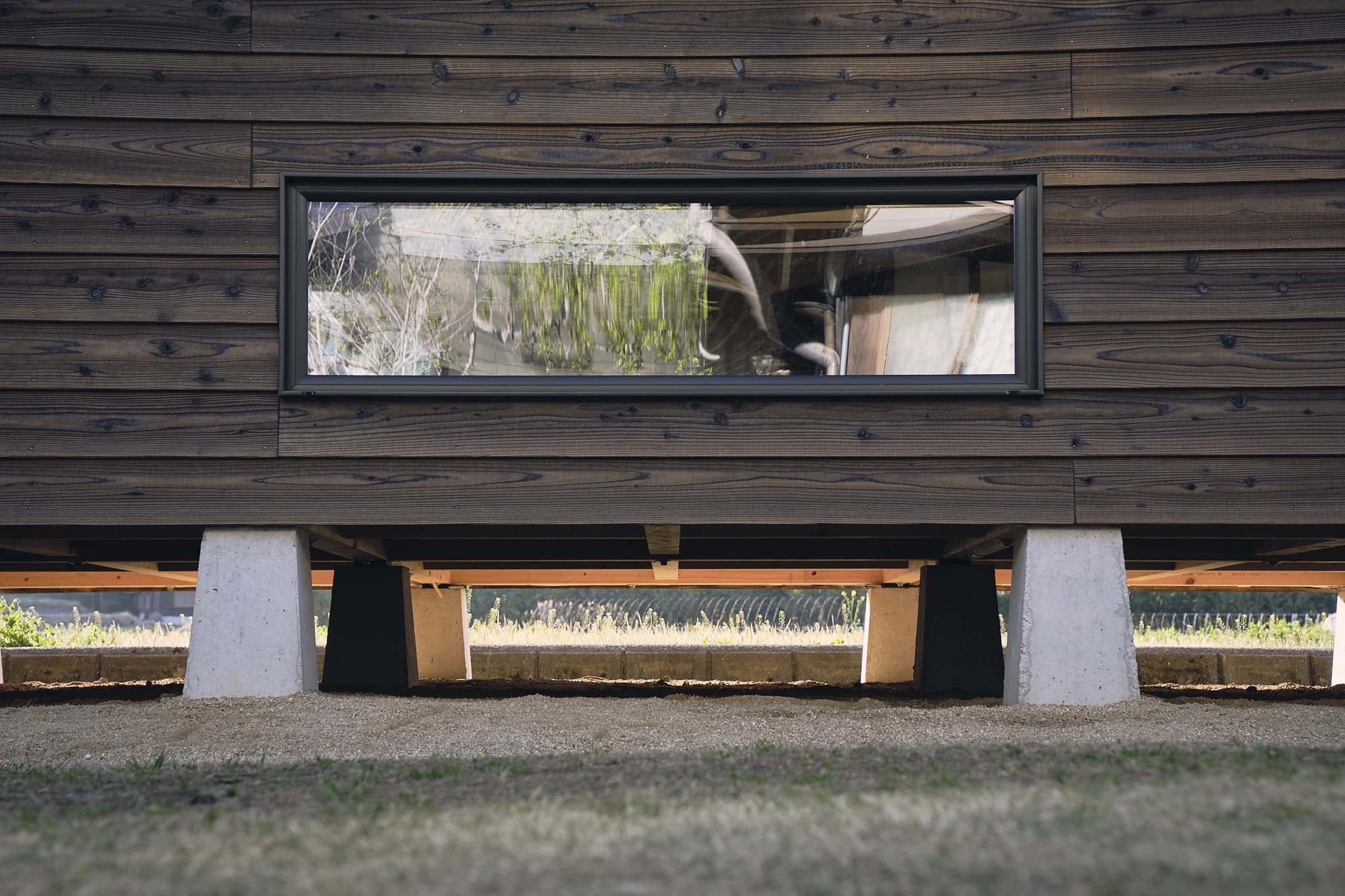基礎部分はコンクリートで地面を覆わず、独立基礎を配して建物が地面から少し浮いたような造りになっている。床下には風が通り、建物の向こう側まで視線が抜ける。以前この場所に建っていた古い納屋を解体したとき、床の下に広がる土を見て、不動さんはその健やかさに心を動かされたという。土が呼吸できるような建て方をしたい——そんな思いが、この基礎のかたちにつながっている。