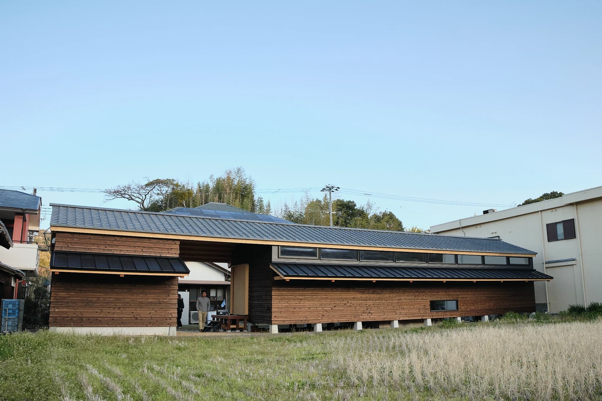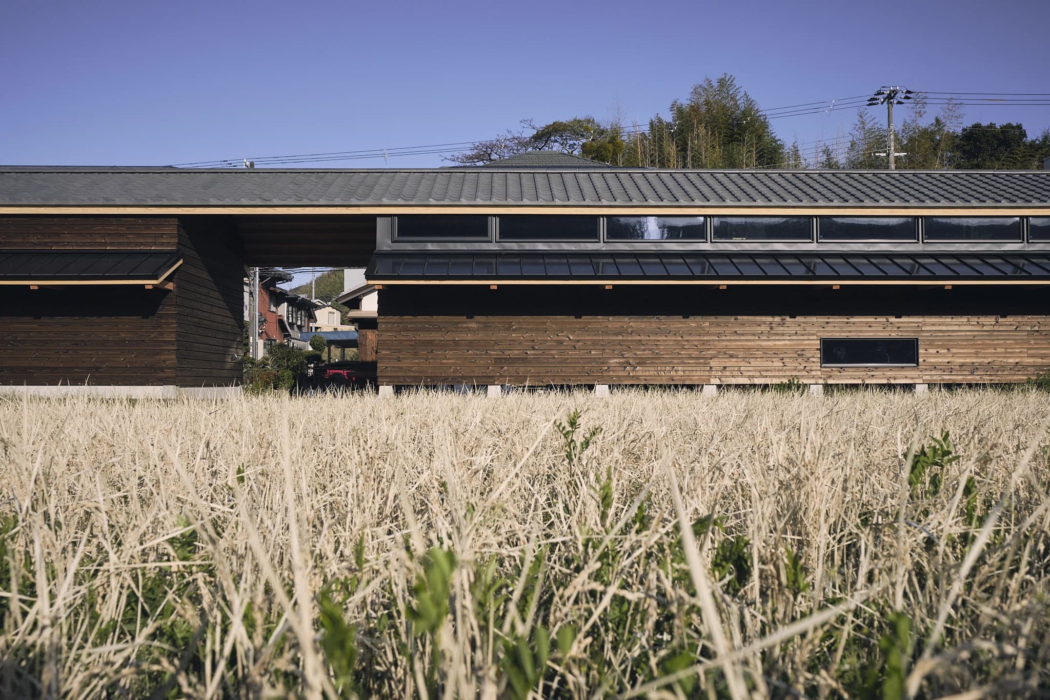 畑の隣に立つその家は、周囲の風景と競うことなく、けれど埋もれもせず、凛とした佇まいでそこにある。建屋は住居と倉庫に分かれており、間に抜かれた空間が、南北にある山と山とを遮ることなく結ぶ。それらをひとつにつなぐように架けられた長い瓦屋根が、風景の中に静かな力強さをもって重なっていた。風に揺れる草、山々の稜線、道沿いに並ぶ民家の瓦屋根——その延長線上に、建物全体がすっと溶け込むように存在している。