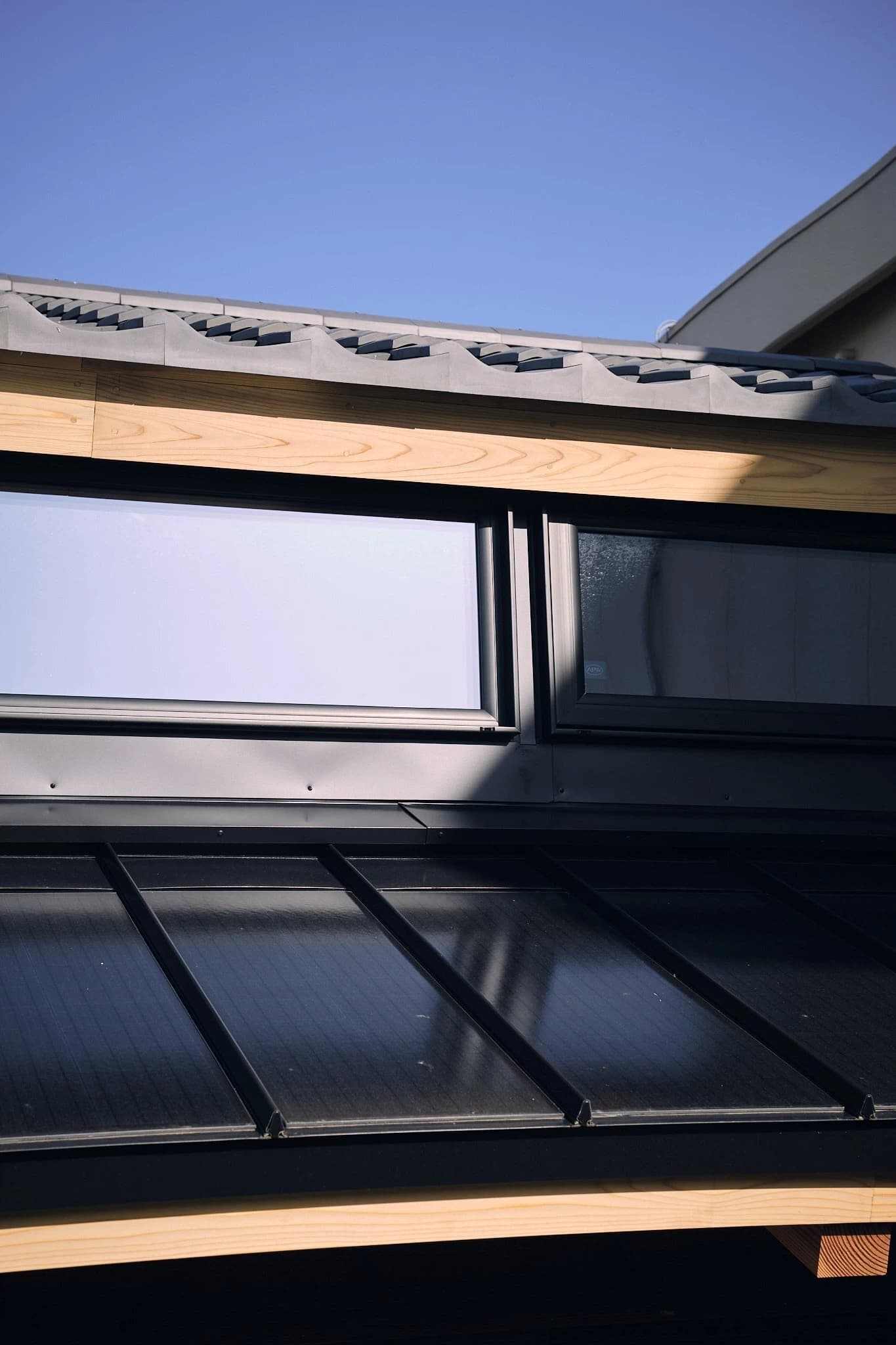 だが、瓦屋根の美しさと太陽光パネルは、時に相容れない。従来のパネルをそのまま載せるのでは、理想とかけ離れた外観になる。瓦屋根との共存を図るために、不動さんが考えたのは、屋根を二段にするという方法だった。メインとなる瓦屋根とは別に、もうひとつの屋根を下に設け、そこに太陽光発電システムを組み込む。採用したのは、モノクロームの屋根一体型の太陽光パネル「Roof-1」だった。