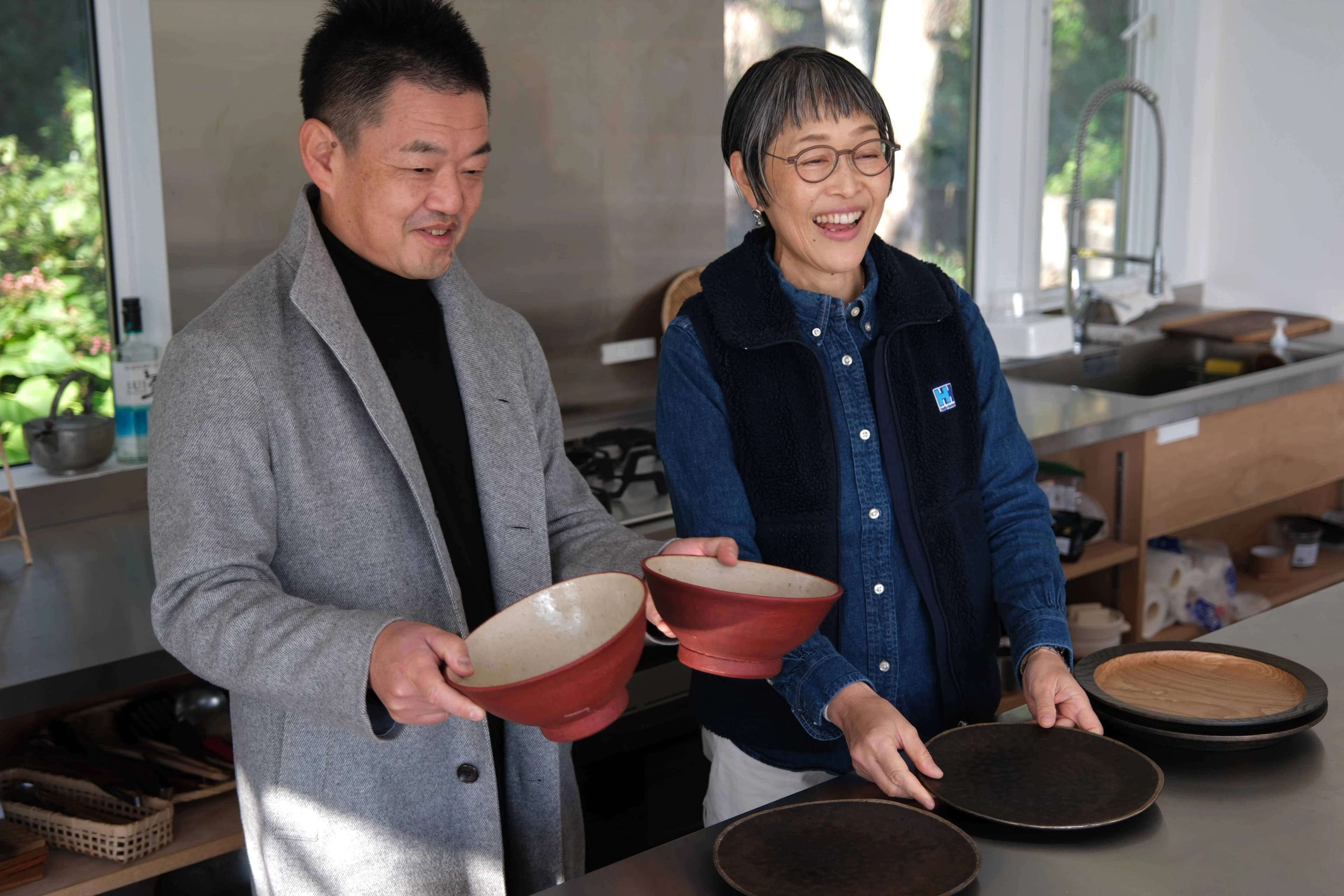 お料理が趣味という明弘さんは、海が見えるキッチン・ダイニングで家族に料理を振る舞い、ゆっくり過ごすのが週末の楽しみだという。盛り付ける器もお気に入りの作家のものを選んだ。姫路市内のクラフト市で出会った作家の作品から、文子さんの滋賀県のご実家から受け継がれているという器まで見せてくださった。 「本当に忙しいことが多くて、事前に調べて買いに行くよりは、旅先でいいなと思ったものや、そこで出会った作家さんのものを買うことが多いです。兵庫の家具作家・TENONさんにお願いして椅子とソファをオーダーしています。」 インテリアもご自身の審美眼を通して購入した日本の作家のものが多く、ご夫妻のセンスが光る。人との出会いや巡り合わせを大切にされるそのお人柄が表れているセレクションだ。