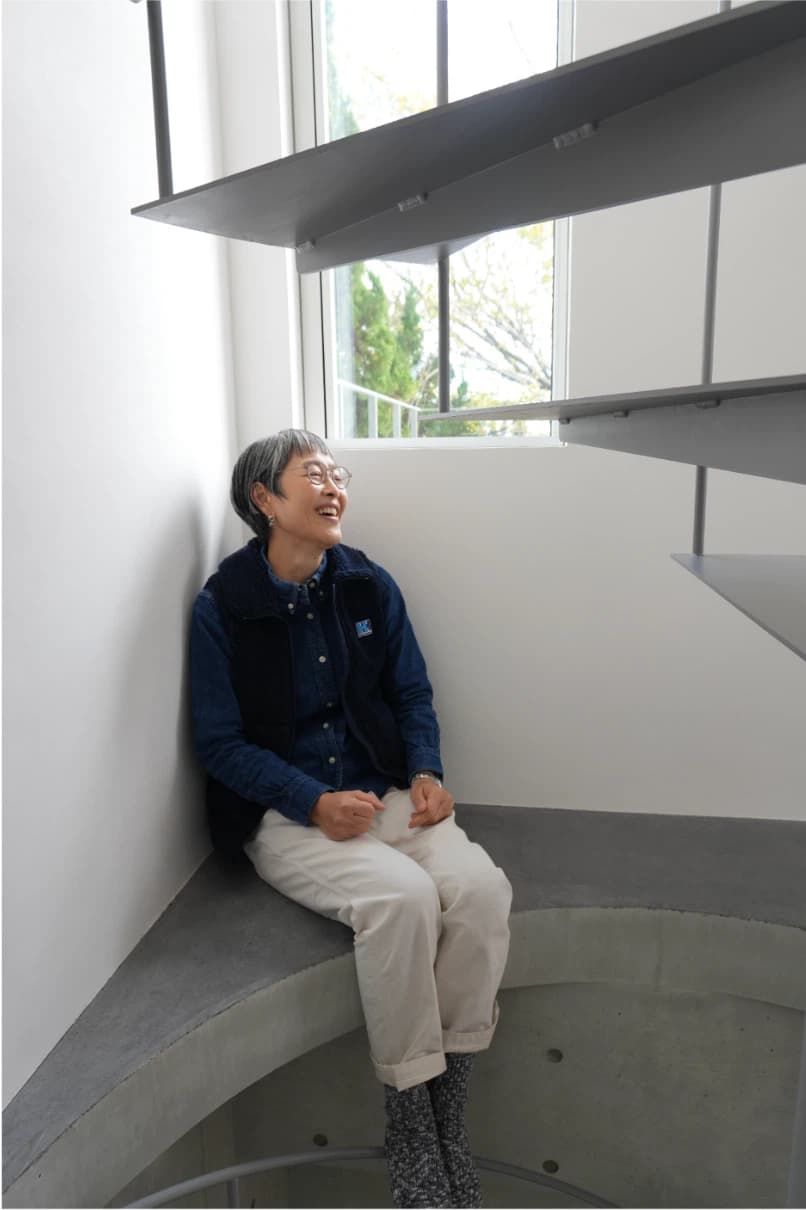 「なーんか、ここに座ると落ち着くんですよ」と、螺旋階段のある吹き抜けのスペースにちょこんと座ってお茶目に語る文子さん。ここがお気に入りスポットだという。部屋の奥に柔らかく差し込む光が螺旋階段を照らし、アートピースのようだ。