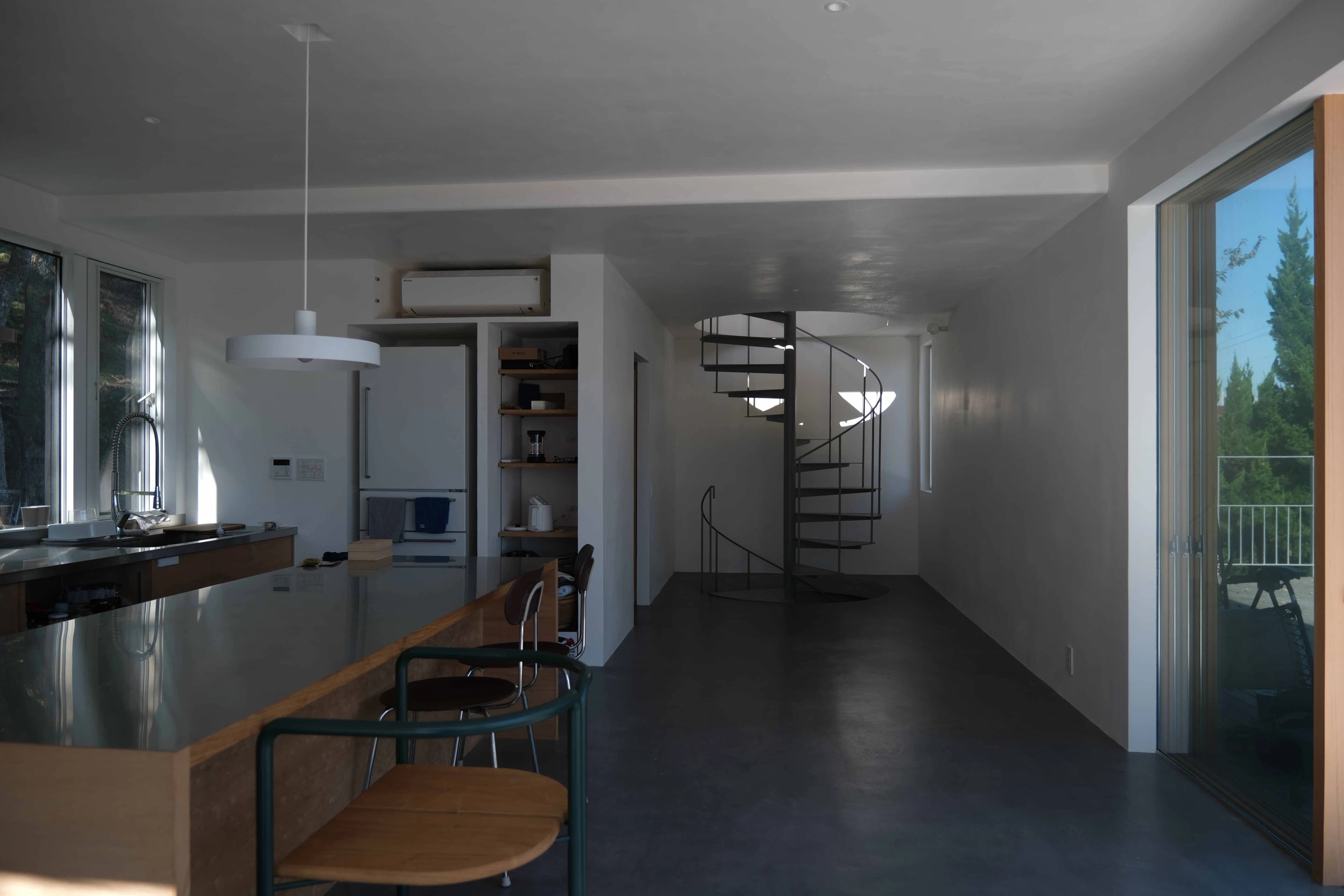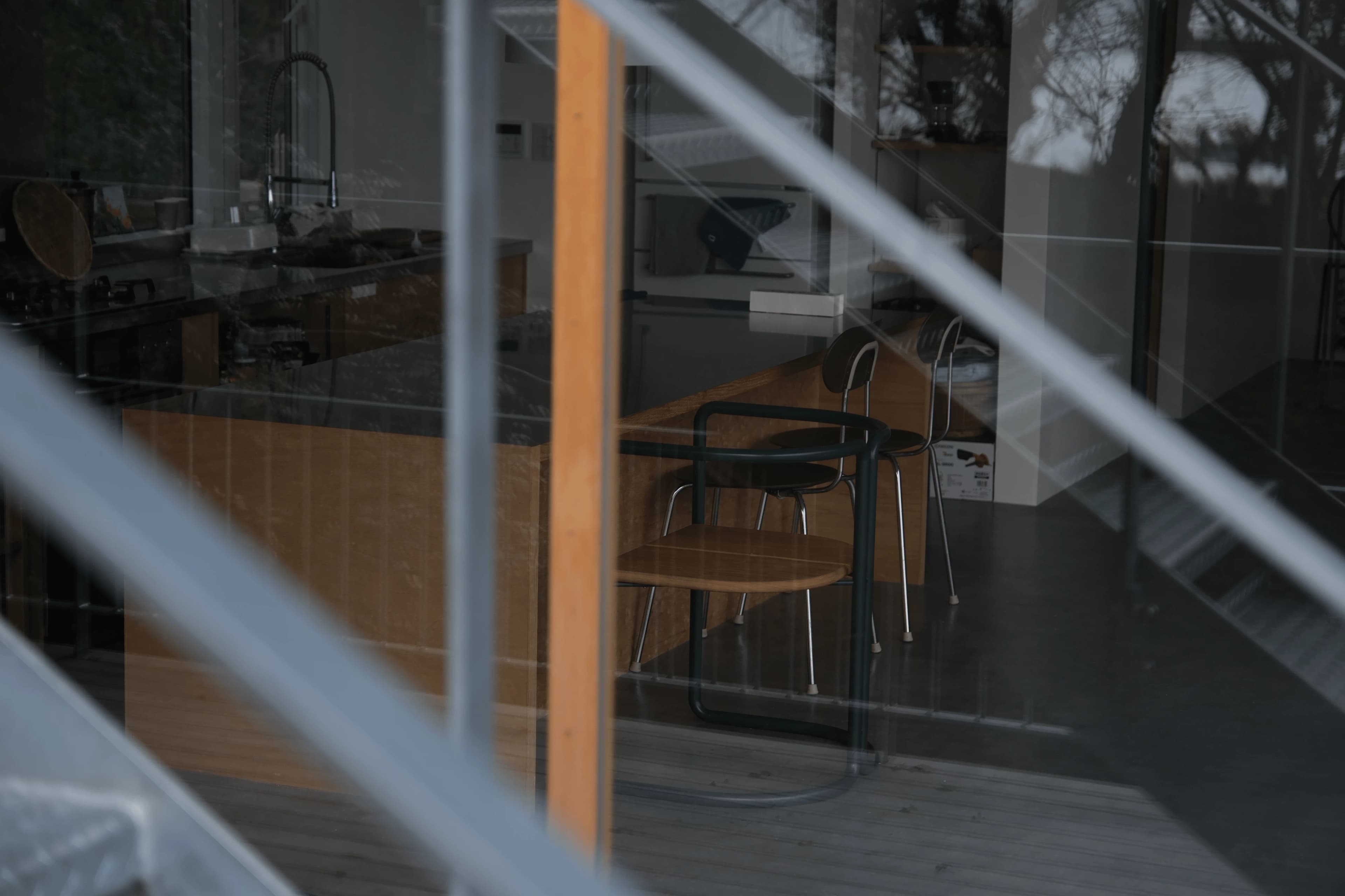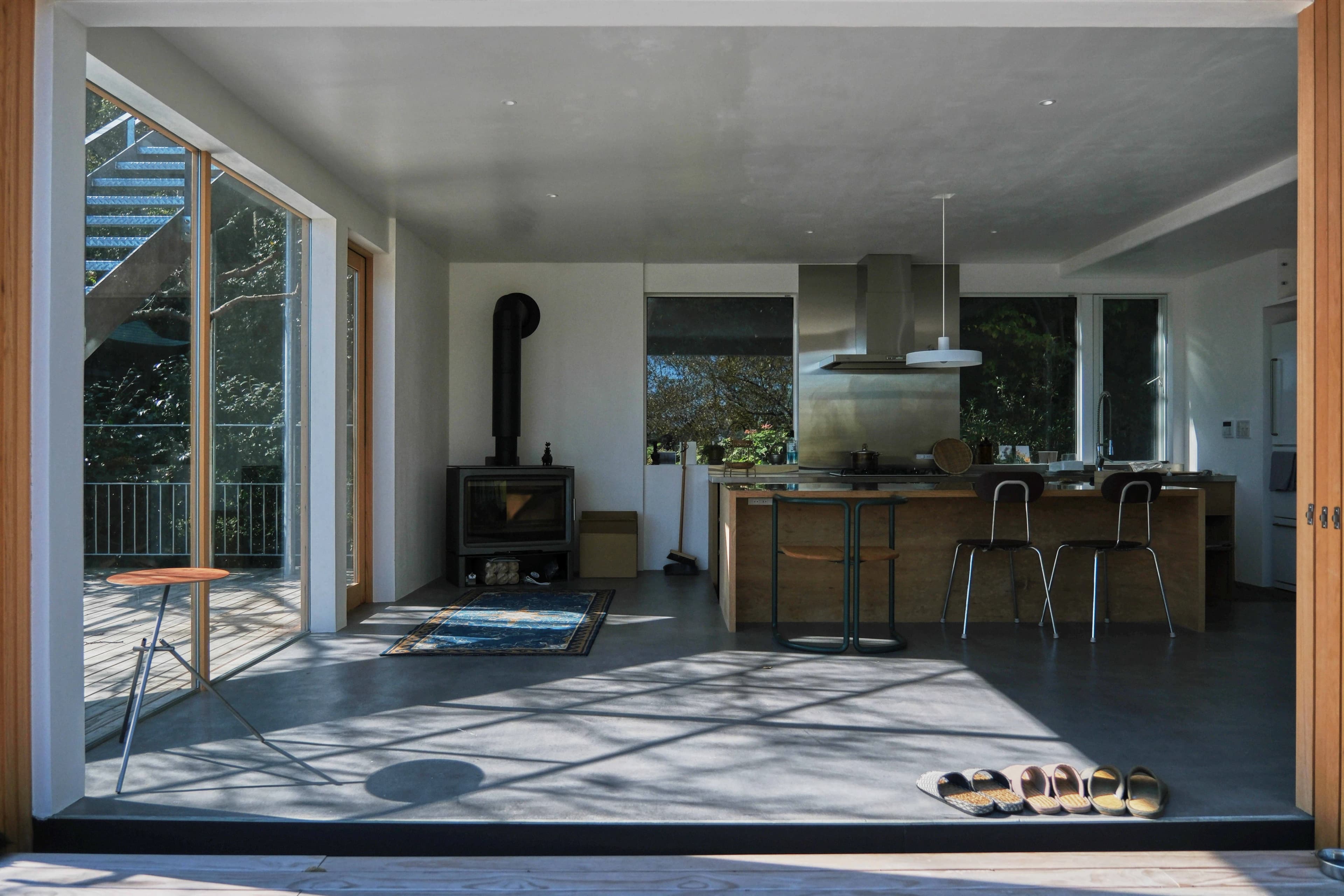外階段をあがり、2階にあがり、そのまま靴をテラスに脱いで家に入る。玄関という概念がなく、テラスから直接家に入れるようになっている。テラスとダイニングは木枠のガラス引き戸で仕切られ、内と外の区別がなくシーンごとに自由に移動ができるように設計されている。
