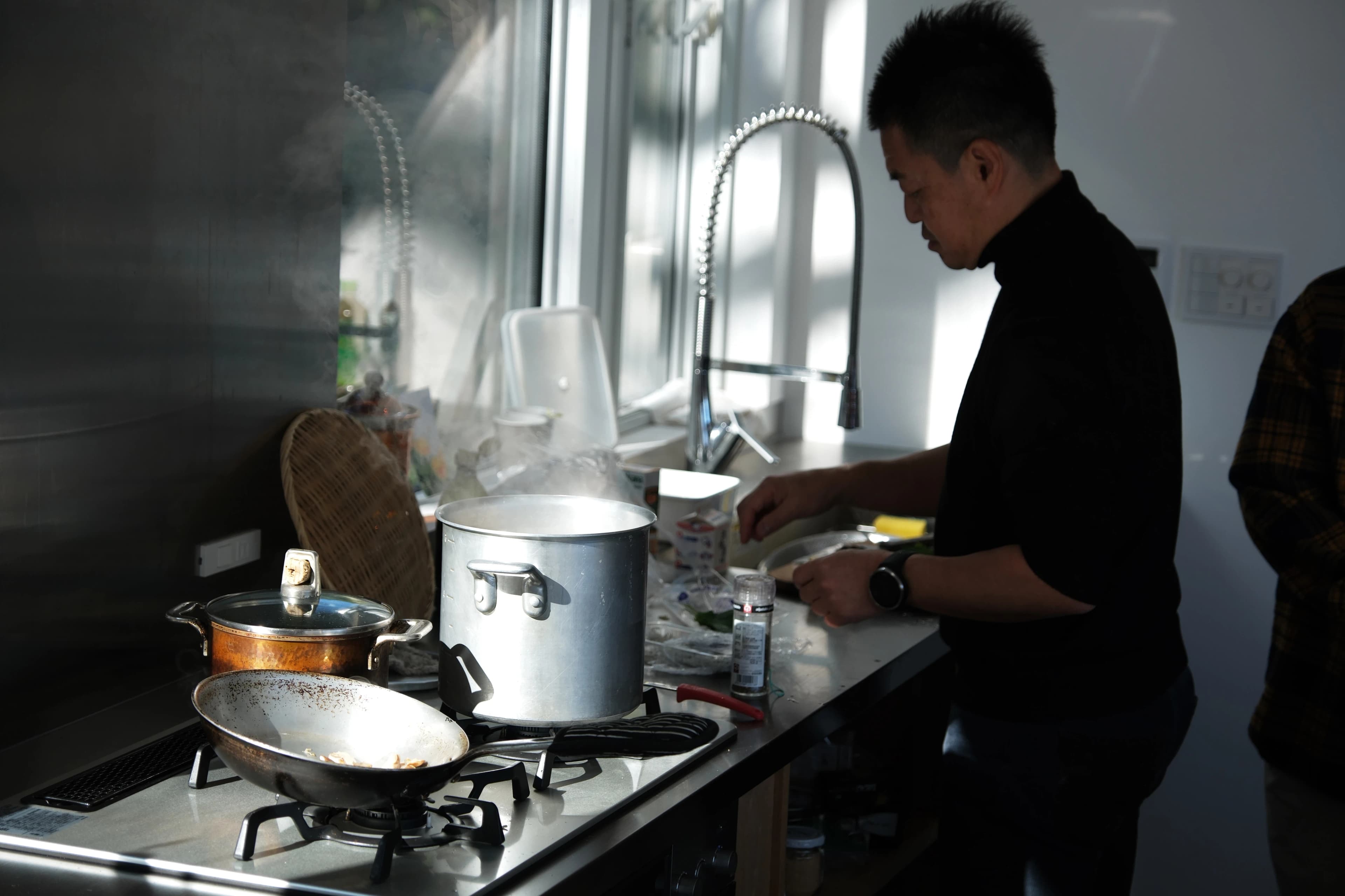 お昼の時間にさしかかり、手際よく料理をはじめる明弘さん。大学時代に卒業旅行のイタリアで目にしたアルミ製のフライパンは、帰国後すぐに入手したという。年季の入った調理器具が、彼の料理へのこだわりを物語る。この日はゆずと大葉が香るシラスのパスタ。