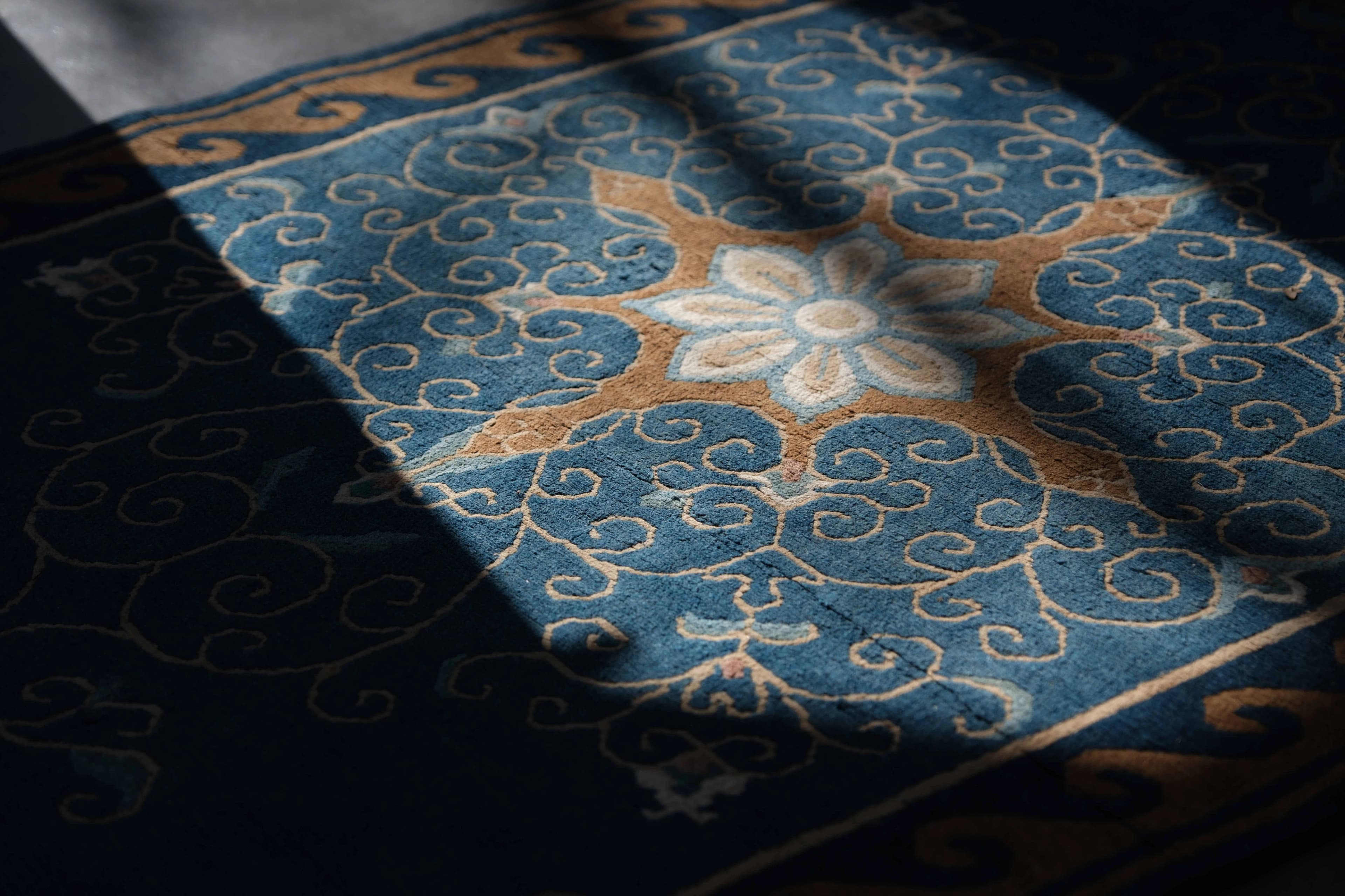 「この家に合いそうだな、と思って赤穂で購入したんです」と、文子さんが見せてくれたのは赤穂緞通。緞通は中国をルーツとする絨毯だが、兵庫県の赤穂エリアで緞通の美しさに感動した一人の女性が、24年の長い年月をかけて明治時代にその生産技術を考案した日本の工芸品。赤穂のある播州地方はかつて綿花の一大産地であり、通常の緞通がウール製であることに対し、赤穂緞通は綿で作られていることや、本藍染が施されていることが日本らしいその特徴だ。戦後にほとんど作られなくなって希少になったが、近年この美しい技術を復興させるための活動が再開されているという。こちらはその活動を中心に行う緞通工房「六月」で購入したという明治時代のアンティークもの古緞通。新築のコンクリートと歴史を刻んだ織物のコントラストが美しい。