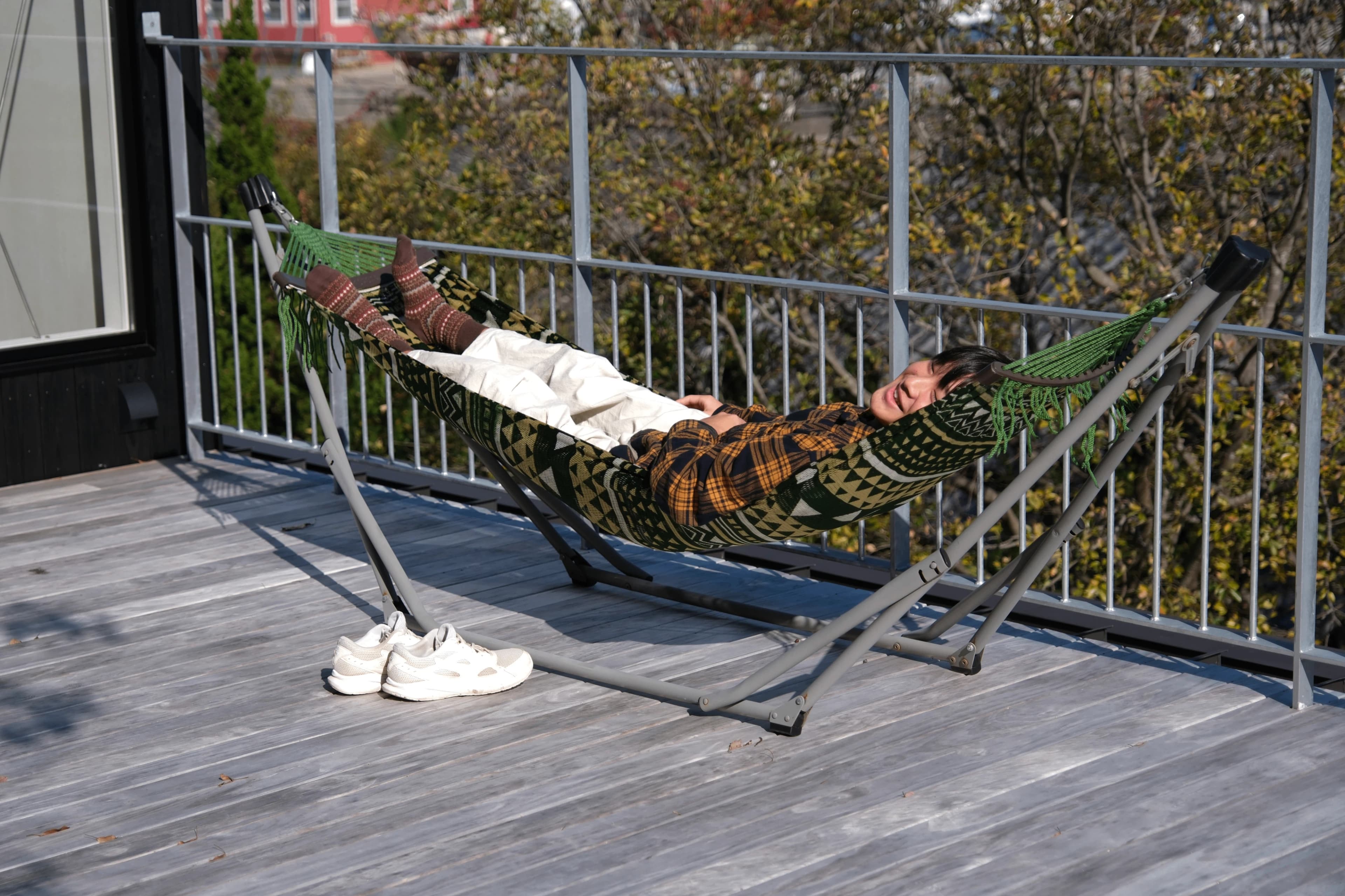 3Fには畳の間とバスルーム。日中は日差しが心地よいスペース、夜には布団を敷いて寝室となる。オーシャンビューのバスルームは白でまとめられ、船舶に使用される防水塗料による水回りの仕上げがこの地の特徴を表現している。テラスに置いたハンモックでは息子さんがゆっくりくつろいでいた。